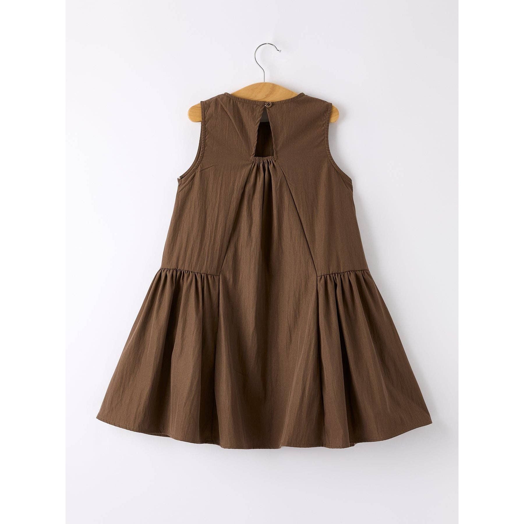 Crafted in a soft earth-toned brown fabric, this dress is soft, features a clean sleeveless bodice paired with dramatic gathered side ruffles that add movement and charm without feeling overdone. The relaxed silhouette offers comfort while still delivering an elevated, fashion-forward look.